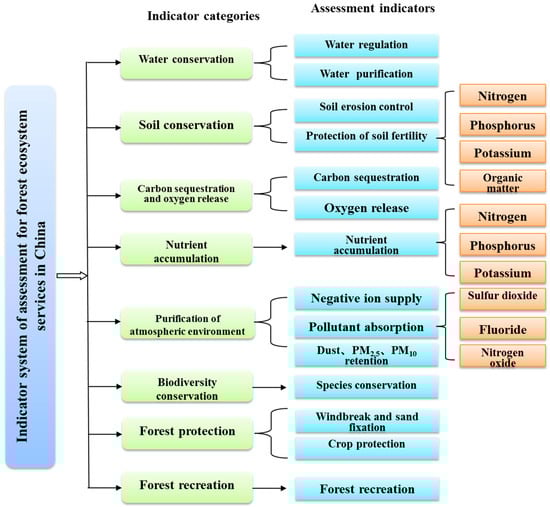 The economic valuation of forest ecosystem services based on calculations using FRIs and eco-station, social and economic data (Figure 3) involves dealing with complex and large datasets from different sources. This requires the use of a distributed valuation approach at different scales: first, by provincial administration (except in Hong Kong, Macao and Taiwan), and then, by forest type, origin (natural or plantation) and stand age (e.g., categories of young, middle-aged, pre-mature, mature and over-mature forest) (Figure 4). Formulas and reference prices are used for fourteen assessment indicators across eight categories of forest ecosystem services: water conservation, soil conservation, carbon sequestration and oxygen release, nutrient accumulation, atmospheric environment purification, forest protection, biodiversity conservation and forest recreation (Table 2 and Figure 5).