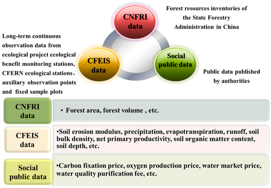 Three data sources including the forest resource inventory, eco-station and public resources were coupled and integrated to develop the DV (Figure 6). The forest resource inventory data contain the forest areas and growing stock, and harvested volume, while the public resources data released via government statistics and prices include social expenses such as water purification costs, sewage charges, etc. The data collected by the eco-stations from representative forest sites are adjusted by 600 secondary observation points and 10,000 long-term permanent plots (30 m × 30 m) via forest ecological correction coefficients [41], to better reflect forest variations produced by different dominant trees, species origins, stand ages and site conditions. Calculations for relatively homogeneous stand polygons (from < 1 ha to >1000 ha in size) are aggregated to scale up to different levels by using statistical sampling principles, remote sensing inversions and model simulations (IBIS, Integrated Biosphere Simulator) [42].