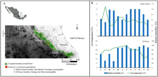 (A) Distribution map of the study forests of the sample Magnolia schiedeana Schltdl. populations across eastern Mexican tropical montane cloud forest (B) climodiagrams from the microclimatic characteristics at data loggers (HOBO®), during the year 2019.