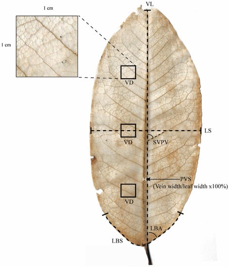 For each cleared Magnolia leaf digitalized, we measured seven venation traits: (1) Leaf shape (LS); (2) Vein length (VL); (3) Primary vein size (PVS); (4) Leaf base shape (LBS); (5) Leaf base angle (LBA); (6) Angle between major secondary veins and primary veins (SVPV); and (7) Vein density (VD). Measurement of all leaf vein traits was carried out according to Hickey et al. [,] and Zhang et al. [] (see Figure 2 and Table 1). Fifty measures were performed for each leaf venation traits (accuracy 0.1 mm) using image analysis software (ImageJ, http://rsb.info.nih.gov/ij/docs/install/index.html).