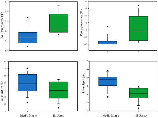 The values of some microenvironmental factors differed significantly between the two Magnolia populations (Figure 3). There was no significant difference in the temperature and canopy openness values between El Gosco and Medio Monte localities. In addition, there was no statistically significant difference in soil temperature, U = 669, N = 40, p = 0.210 and soil moisture, t = 1.597, degree freedom = 18, p = 0.128). In contrast, the differences in the canopy openness and litter depth values between the two localities were greater than the expected by chance and hence statistically different (canopy openness, U = 406, N = 40, p = <0.001; litter depth, t = 3.665, df = 18, p = 0.002).
