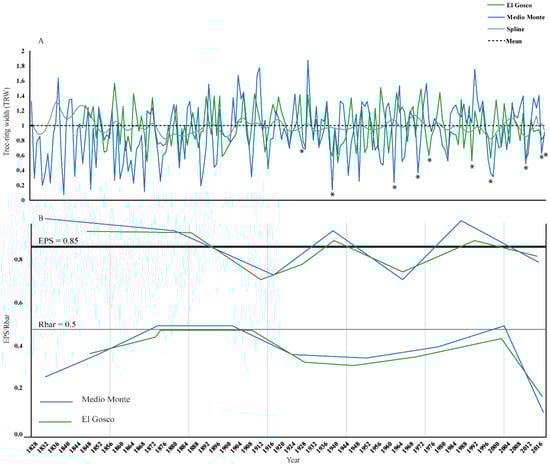 (A) Ring-width chronologies of M. schiedeana from Medio Monte and El Gosco localities. Black asterisks represent the drought events (1929–1930, 1940, 1963, 1970, 1972, 1976, 1983, 1991, 1999, 2012, 2015–2016, and 2018–2019). (B) Expressed population signal (EPS) and effective signal (Rbar) for the two Magnolia schiedeana populations chronologies (Table 3) calculated using a moving window of 30 years. An EPS threshold of 0.85 is depicted in black, and a Rbar threshold of 0.5 is depicted in gray.