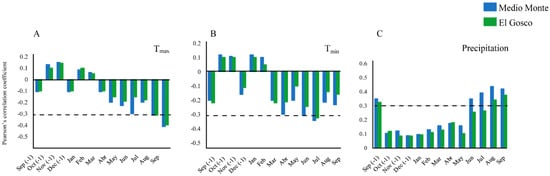 Correlations between chronologies against the mean maximum temperature (A), mean minimum temperature (B) and monthly precipitation (C) for each drought year (DY) (September (−1) to September) from the year 1941 onward. Horizontal dashed lines indicate the significance intervals (p < 0.05) for correlation coefficients. (−1) show the previous years and (+1) the following years in which growth started.