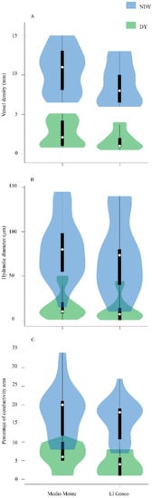Violin plots showing differences in vessel traits between drought years (DY) and non-drought years (NDY) for both Magnolia schiedeana populations studied. (A) VD; (B) hydraulic diameter (Dh) and (C) percentage of conductive area (PCA).