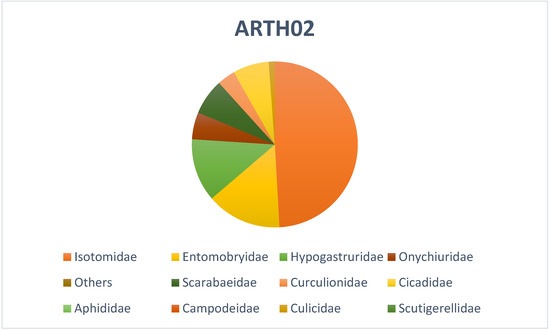 Arthropods (Figure S2) detected by the Arth02 primer set were the first target. The most abundant arthropod family was Isotomidae (Figure 1). The composition of fauna community belonging to similar habitats, e.g., habitats that share environmental features (such as the mixed coniferous forest and larch forest), was fairly similar. These forests (Table 2) even contained the same collembolan families: Isotomidae, Entomobriydae, Hypogastruridae, and Onychiuridae. Spruce forest showed a similar pedofauna community, but compared to the larch and mixed coniferous forest, it had fewer sequences of Entomobriydae and Onychiuridae; then, the second most represented family in the spruce forest was Hypogastruridae. The two grasslands studied show similarities in community composition of arthropods, even though the second and the third most represented family differed from one other: in acidic grasslands were Cicadidae, Scarabaeidae, and Curculionidae, while in the calcicolous grasslands were Scarabaeidae, Hypogastruridae, and Curculionidae.
