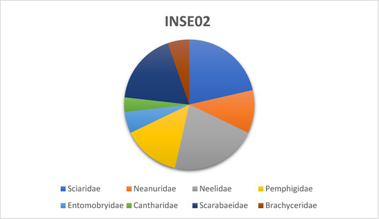Concerning the targets detected with the primer INSE02 (Table 2, Figure 2 and Figure S3), the most representative family detected depend on the habitat studied. For example, spruce forest and mixed coniferous forest had communities composed of mostly Pemphigidae, Neelidae, and Entomobryidae. Meanwhile, the larch forest showed a composition dominated by Sciaridae, Neanuridae, and four families with the same records: Neelidae, Pemphigidae, Entomobryidae, and Cantharidae.