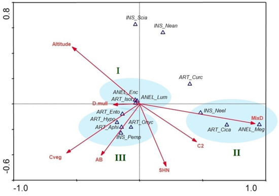 Biplot of grassland environmental features and soil communities resulting from CCA analysis (environmental features are indicated in red, soil communities are indicated in black with a blue triangle, and blue circles with the Roman numeral indicate clusters). The suffixes ART, ANEL, and INS refer to the targets: arthropods, annelids, and insects.