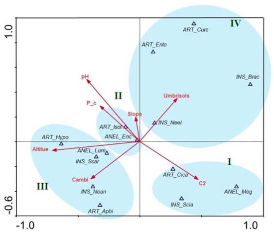 Biplot of forests environmental features and soil communities resulting from CCA analysis (environmental features are indicated in red, soil communities are indicated in black with a blue triangle, and blue circles with Roman numeral indicate clusters). The suffixes ART, ANEL, and INS refer to the targets: arthropods, annelids, and insects.