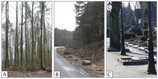 Tilia cordata Mill. trees were selected from the area of the Greater Poland-Pomerania Natural Forest Regions, located in North-Western Poland (Figure 1). The area is characterised by a similar climate, a similar geomorphologic layout, similar potential natural vegetation and forests [23,24,25]. The research used trees growing in three areas which had been chosen on the basis of a degree of an environmental stress impact. The selected trees were from the environment of the lowest stress, i.e., a forest (tree A—cambial age: 50 years old), of moderate stress, i.e., by a roadside running through forest areas (tree B—130 years old) and of the highest stress, i.e., in a big urban agglomeration (tree C—100 years old) (Figure 2).
