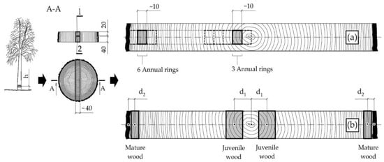 - Bao, F.C.; Jiang, Z.H.; Jiang, X.M.; Lu, X.X.; Luo, X.Q.; Zhang, S.Y. Differences in wood properties between juvenile wood and mature wood in 10 species grown in China. Wood Sci. Technol. 2001, 35, 363–375. [Google Scholar] [CrossRef]