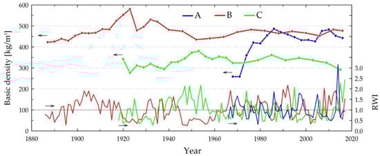 Above the RWI time series, sample basic density from corresponding calendar years has been plotted (Figure 4). In diffuse-porous trees, radial variation of wood density differs between species [42,43,44]. Fukuzawa [42] reported for Tilia japonica (Miq.) Simonk. a wood density increases with the distance from pith. Wood basic density radial variation, characteristic for diffuse-porous trees, was retained only for a tree growing under the lowest environmental stress conditions, i.e., in the forest (tree A). In the described case, juvenile wood near pith is characterised by distinctly lower basic density (approx. 250 kgm−3) than mature wood near bark (approx. 450 kgm−3). For trees growing near the forest road and in the urban agglomeration (B and C), density undergoes certain fluctuations, but basically does not vary between their pith and a girth. A minor difference of juvenile and mature wood density which was recorded for trees B and C may result from an influence of moderate and high environmental stress conditions, respectively. What is more, for the forest and by-roadside tree (A and B), mature wood basic density coincides with the values reported in literature (in range 0.41–0.50 g/cm3) [45,46]. In the tree wood growing in the urban agglomeration (C), with the highest environmental stress, juvenile and mature wood basic density is at a lower level, i.e., 0.30–0.40 kg/m3.