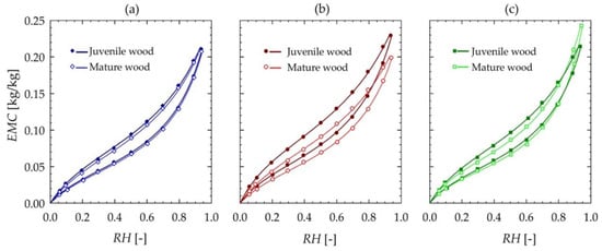 The sorption experiments’ results presented in Figure 5 generally support earlier conclusions that hygroscopic properties of juvenile and mature lime wood differ [22]. The lowest differentiation of hygroscopic properties regards the juvenile and mature wood tissue of the tree growing under low stress conditions (A), i.e., in the forest (see Figure 5a). In the case described, equilibrium moisture content which is gained by the juvenile wood is slightly higher than for the mature wood in all the range of air relative humidity (0–0.95). In the remaining cases, i.e., regarding moderate and high stress, (B and C) respectively, a higher variety of the mature and juvenile wood hygroscopic properties was reported. However, it is peculiar that for the tree growing under high stress conditions, i.e., in the urban agglomeration (C), for air relative humidity near saturation (RH above 0.90), the juvenile wood shows explicitly lower equilibrium moisture content than the mature one.