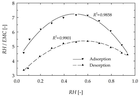 The results of sorption experiments are presented in Figure 5. Each plot consists of two sets of isotherm loops, i.e., juvenile and mature wood taking into account growth conditions. The isotherms were constructed by calculating the GAB model to each set of experimental data, i.e., measured EMC values are also depicted in the plots. The GAB sorption model is separately fitted to juvenile and mature wood samples for which adsorption and desorption isotherms were determined. Figure 6 typifies ratio RH/EMC versus air relative humidity for adsorption and desorption of juvenile lime wood. The fitting results for all the sets of the wood samples are presented in Table 7.