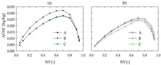 The sorption hysteresis ΔEMC of the (a) juvenile and (b) mature lime (Tilia cordata Mill.) wood at 20 °C taking into account growth conditions (A—forest, B—roadside, C—urban agglomeration).