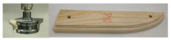 20 routing samples for each tree species with radial or tangential texture had the dimensions of 305 × 76 × 19 mm. First, a preliminary roughing cut was made with the router to approximate the shape (Figure 1). Then, the second roughing cut was made to remove any damages made in the first cut, whereupon a final finishing cut was made, where the thickness of the cut was 1.6 mm. The edge of the specimen was parallel for half of their length, while the remainder of the length was parabola (Figure 1). The spindle speed of the router and feed speed amounted to 8000 rpm and 3000 mm/min respectively, where the milling head had 2 knives.