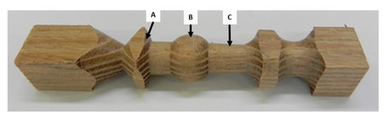 Specimen for turning test with locations A, B and C for assessment of the quality of turning, made of black locust (Robinia pseudoacacia L.).