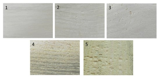 Several different methods that are used for checking the roughness of other materials have already been tested on wood surface. These are contact (stylus, pneumatic, acoustic emission) or non-contact (optical light sectioning and image analysis using video camera) methods [,]. The stylus instrument mechanically measures the surface profile in the selected area, but several researchers report that some significant parameters are still not fully explained and understood when analyzing the wood surface [,,]. However, only gross comparison is possible using these methods, and specific information about the surface is not quantifiable []. There is no unique parameter that is able to describe the quality of the wood surface [] and there is no commercially available device to be used specifically for wood surface measurement.