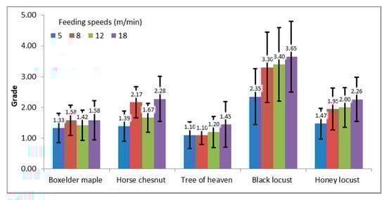 Average surface quality grades and standard deviations for tree species after planing at different feeding speeds.