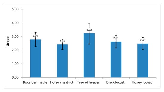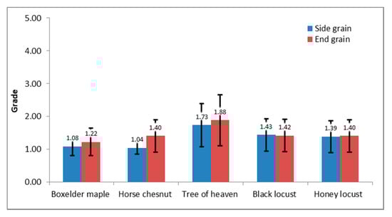 The average grades for side and end grain routing together with the standard deviations for each tree species are presented in Figure 5. Boxelder maple has the best grades with the average grade of 1.08 and 1.22 for side and end grain respectively, and horse chestnut with the average grade of 1.04 and 1.40 for side and end grain respectively, while tree of heaven has the worst grades with the average grade of 1.73 and 1.88 and also the highest standard deviation. An ANOVA analysis has shown a significant difference in surface quality between the side and end grain routing only in the case of tree of heaven, as shown in Table 4, while for other species, there is no significant difference between the directions of routing.