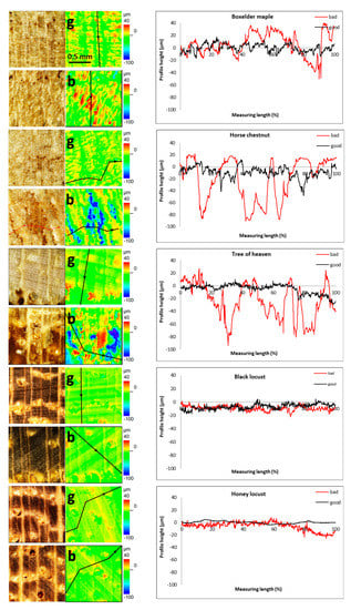 Figure 6 shows the scanned end grain areas and roughness profiles of individual tested tree species, one for the best surface (designated as good surface) and one for the worst surface (designated as bad surface). Comparison of the roughness profiles of good surfaces reveals great differences between tree species, where honey locust has the smoothest line and horse chestnut has the roughest. Similar results are obtained from profile roughness parameters (Figure 7), where tree of heaven has the worst values for both area and profile roughness parameters, similar to the visual assessment grades shown in Figure 5.