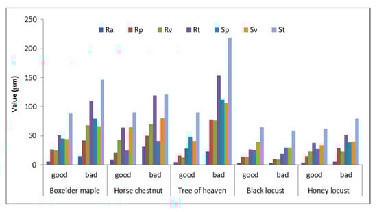 Area and profile roughness parameters for different tree species. “Bad” and “good” designation represents the best and the worst quality surface, respectively. Ra—arithmetic mean of all deviations from the center line over the sampling path, Rp—maximum profile peak height along the sampling length, Rv—maximum profile valley depth along the sampling length, Rt—total height of profile, Sp—height of the highest peak within the defined area, Sv—absolute value of the height of the largest pit within the defined area, St—distance between the largest peak height value and the largest pit depth value within the defined area.