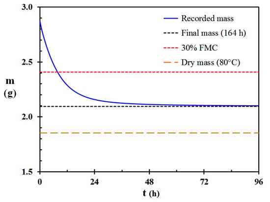 Recorded mass as a function of time for a 6.01 mm (±0.11 mm) diameter Calluna test specimen. The final mass after 164 h, the mass after oven drying at 80 °C and the mass at a 30% fuel moisture content (FMC) threshold value for sustainable fire in Calluna stands [] are also marked on the figure.
