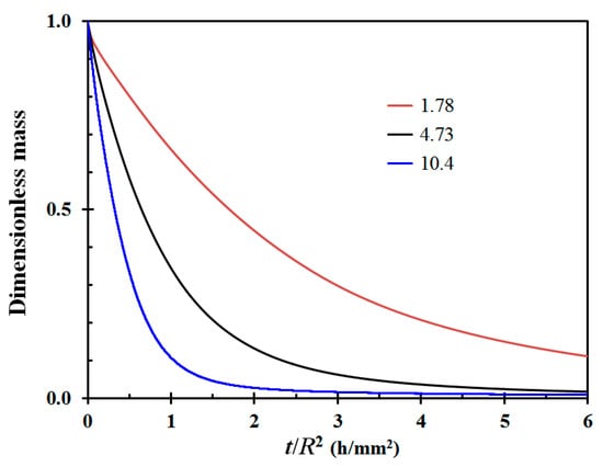 The dimensionless mass of water being evaporated during drying is shown in Figure 3. The recorded values for and , respectively 21,005 s (5.83 h) and 42,650 s (11.85 h), are also marked on the figure. Using the recorded values for , and the test specimen radius, the moisture diffusion coefficient according to Appendix A, Equation (A14), was found to be 4.73 × 10−11 m2/s. When the moisture diffusion coefficient is known, it may be used for the numerical model presented in Appendix A.4.