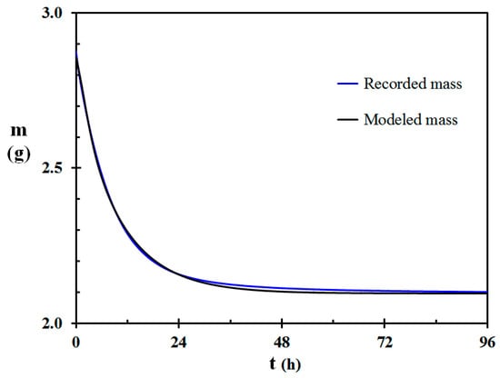 Recorded and modeled mass as a function of time for the 6.01 mm (±0.11 mm) diameter Calluna test specimen is shown in Figure 5. The modeled mass during drying generally follows the recorded values quite well. Some deviations between these two curves may, however, be observed.