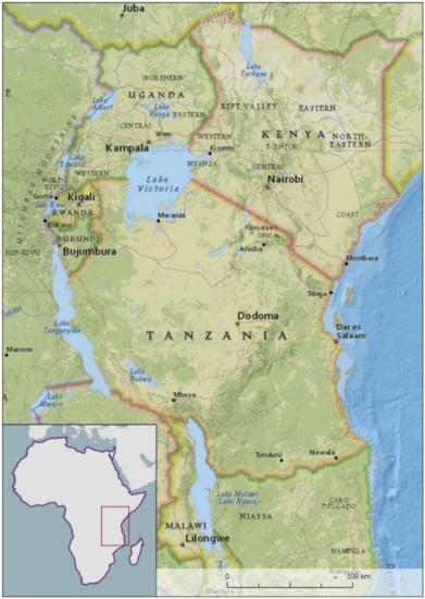 Artisanal and small-scale mining (ASM) is one of the most important rural non-agricultural activities in the developing world. It is an important source of employment and income for dozens of millions of people and brings economic benefits to other millions who are not directly involved in ASM. According to some estimates, six secondary jobs are created for each job in the ASM sector []. The most discussed topics in ASM include socio-economic aspects of mining [,,,,,], child labor [,], women’s labor [,,,,,] and the role of minerals in armed conflicts [,]. Less attention is then paid to the actual environmental impacts of mining and their typology [], with these topics being only marginally addressed in scientific papers. The environmental impacts of ASM in the Great Lakes Region (the author uses the geography division similar to Mpangala [] or Schütte et al. [], that includes Uganda, Kenya, Tanzania, Burundi, Rwanda, and the eastern part of the Democratic Republic of Congo, or the province of North Kivu, South Kivu, and Katanga in the Great Lakes Region—Figure 1) and Africa are grouped into four categories. The four categories are: (1) Changes in landscape structure—deforestation (primary and secondary) and land cover change. (2) Influence of geomorphological processes—weathering, mass movements, fluvial processes, aeolian processes, creation of new anthropogenic forms. (3) Influence of hydrological regime—water contamination, sedimentation of water stream. (4) Influence on fertility of soil–Soil contamination, high dustiness, land use change [].