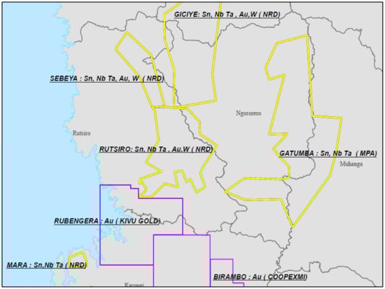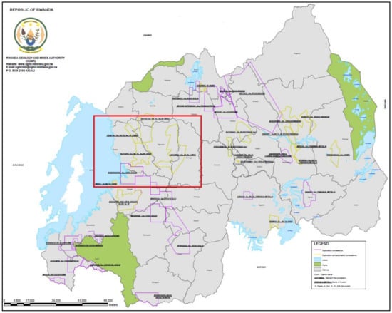 - Rwanda Geology and Mines Authority. Great Exploration and Exploitation Concessions; Rwanda Geology and Mines Authority: Kigali, Rwanda, 2014. [Google Scholar]