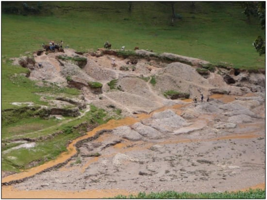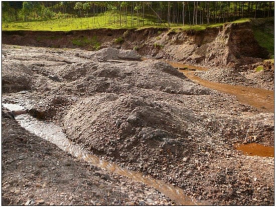 Another anthropogenic landform is barren rocks and their influence on the lower part of the slope of an alluvial plain disturbed by ASM (Figure 5). The barren rock generated by this activity are in many cases commonly discharged and moved to the surroundings in the mining area due to insufficient legislative standards or simply due to a lack of storage facilities. Therefore, these technological processes have a great influence on geomorphological processes and on the environment []. The actual geomorphological processes also take place on heaps, in barren rocks, or in areas where wastewater is stored. The deposition of barren rock and the consequent instability of slopes leads to the acceleration of slope processes []. Then, the extracted material can enter a watercourse and lead to an increase in sediments and mud in the landscape, despite the transfer of toxic material downstream and subsequent deposition elsewhere downstream [,,,,].