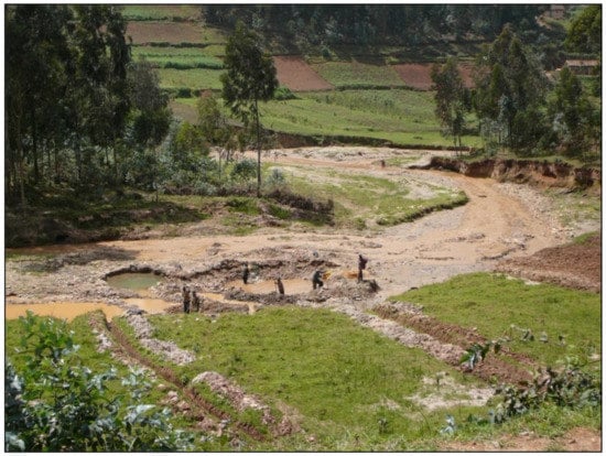 ASM in Rwanda is characterized by hard rock mining and shallow alluvial mining. Hard rock mining is mining by the extraction of material from mineral veins. Shallow alluvial mining is mining from alluvial sediments, where material is extracted followed by the “dig and wash” technique [,]. By using these two types of mining, miners destabilize the river channel by bedrock mining on the riverbanks. An ore-bearing rock washing process occurring in the river has an additional effect on drinking water quality. Mining activities result in the degradation of riverbeds and riverbanks, and changes in water flow. The result of these activities can be observed, among other things, in the lower reaches of rivers, where sedimentation of suspended sediments, widening of the watercourse and in some cases also a reduction in water flow and drying of the riverbed occur. The mining in the alluvium then significantly contributes to the acceleration of natural geomorphological processes. The primary objective is to document anthropogenic impacts of the alluvial ASM of mineral raw materials, especially 3T minerals (tin, tantalum, tungsten) on a fluvial landscape in Rwanda. The paper aims to bring to ASM issues expanding knowledge about alluvial mining. Based on the previously created typology of environmental impacts in Macháček (2019), alluvial mining will be incorporated in the noted typology and new relief shapes formed during this type of mining will be defined. Furthermore, the impact of alluvial ASM on the riverscape will be analyzed in connection with the degradation of arable land, which is especially in developing countries an important source of livelihood for the local population.