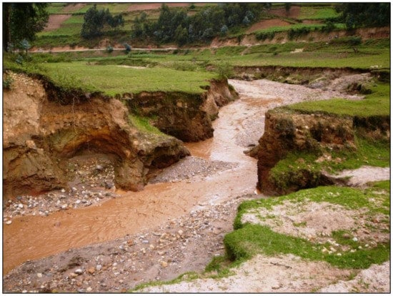 Fluvial processes are associated with running water activities, which is the main erosion factor. The development of the landscape and the river network is dependent on fluvial processes. A fundamental factor for influencing fluvial processes is the disturbance of vegetation cover in the spring sections of watercourses []. An important factor associated with fluvial processes is deforestation. Deforestation can occur as a result of fires, forest clear-cutting aiming at expansion of arable land, or as a result of mineral raw material mining [,,]. The combination of these phenomena is a common cause of influencing fluvial processes in developing countries. Vegetation cover, especially forest stands, plays an important regulatory function, retaining some of the water that falls in the form of precipitation, thus slowing down evaporation. Soil erosion entails soil degradation, and this leads to a reduction in its fertility. In addition to fluvial erosion, organic matter loss, salination, and chemical contamination also contribute to soil degradation. The intensity of fluvial processes can be expressed numerically by the volume of eroded and transported material by watercourses. This material is in the form of suspended sediment, which, however, demonstrates the speed of natural and anthropogenic processes together [].