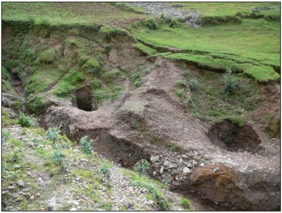 The human-induced relief is a product of natural processes at a place and time and is completely dependent on anthropogenic activity. In ASM areas, geomorphological processes take place in setting pits, mining pits, and barren rock or in their vicinity. These elements were created primarily by human activity and are features of human-induced relief. The result of such disruption of the relief is wash and other erosion rills, which later expand, thus resulting in even greater disruption of the already affected relief. These processes can subsequently result in formation of badlands []. One disruption in a slope where intense ASM takes place can lead to subsequent destabilization of the upper part of the slope, resulting in cracks. In this way, the strength of the slope is reduced. If the cracks are filled with water, which occurs in the form of precipitation, weakened rock blocks can collapse and slide. These weakened zones often provide an area for further mass movements at the top of the slope. The landslides themselves then often adversely change the slope geometry and lead to further instability of the rock environment. Less obvious and more hidden are the movements inside the rock environment. The strength of these deposits is significantly affected by internal displacements, which can be converted at the points of movement by pressure from relatively loose material to firm parts on which movement takes place. Byizigiro et al. [] found that this effect was stronger and more effective in the walls of mining pits parallel to the shale layers, which are largely eroded by landslides.