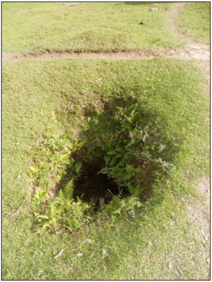We refer to the human-modified relief when the extent or speed of geomorphological processes is changed by human activity []. The main mechanism that triggers the formation of these processes is the change in hydrological balance. This change can occur due to a change in the soil cover, exploratory wells or over-extraction, which disrupts the groundwater supply.