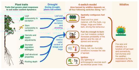 Conceptual model illustrating linkages between drought-related plant traits and the likelihood of wildfire. The 4-switch model is outlined in Bradstock [14].