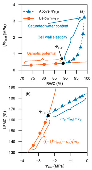 Pressure–volume curves are typically derived from repeated measurements of Ψleaf and RWC on a cut leaf or shoot dehydrating on a bench. As leaves dehydrate, cell volume shrinks, turgor pressure decreases and osmotic potential (Ψπ), and thus Ψleaf, decline [34]. The curve is obtained by plotting −1/Ψleaf as a function of RWC (Figure 2a). Above the turgor loss point (ΨTLP), the curve is non-linear, but it approaches a linear relationship as −1/Ψleaf falls below the ΨTLP [34]. This relationship can be reformulated to express LFMC as a function of Ψleaf by simply replacing RWC with LFMC as follows (Figure 2b):
