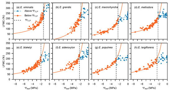 Decline in LFMC and Ψleaf modelled using Equation (3) (for data > ΨTLP) and Equation (4) (for data < ΨTLP: −1/Ψleaf versus LFMC), for saplings of eight Eucalyptus species. Species are ordered by increasing moisture index (ratio of precipitation to potential evapotranspiration) from climate of origin, i.e., E. largiflorens is from the most arid climate. Regressions for all species were statistically significant (p < 0.05), except the slope of the linear regression above the ΨTLP for the following species: E. grandis, E. melliodora, E. blakelyi, E. populnea and E. largiflorens. (a) E. viminalis; (b) E. grandis; (c) E. macrorhyncha; (d) E. melliodora; (e) E. blakelyi; (f) E. sideroxylon; (g) E. populnea; (h) E. largiflorens.