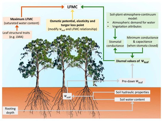 Drought-related plant traits, such as rooting depth and the leaf traits which modify the relationship between RWC and Ψleaf, affect the development of critically low values of LFMC (Figure 2a). Thus, existing models for the prediction of live fuel moisture content models may be improved by incorporating these traits (Figure 4). There is already recognition that plant traits play a role in forest flammability. For example, leaf size and shape affect the packing of litter beds, which in turn affects ignitability (i.e., ease of ignition; [36,48]). Similarly, leaf mass per area of live foliage affects ignitability [49,50]. We now discuss the role of plant traits in determining LFMC dynamics.