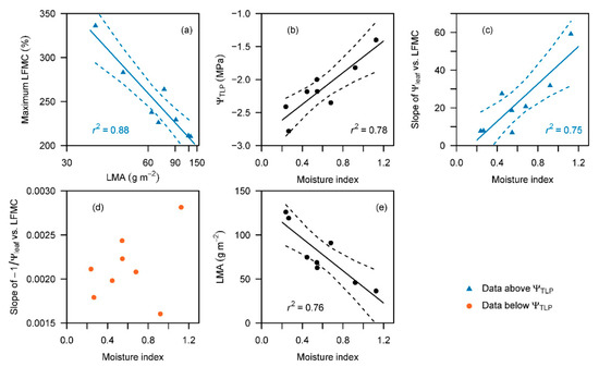 Relationship between (a) maximum live fuel moisture content (LFMC) and average leaf mass per area (LMA) in eight Eucalyptus species in a common garden experiment; and (b–e) plant ecophysiological traits and the moisture index from the climate of origin (calculated as the ratio of precipitation to potential evapotranspiration), including (b) the turgor loss point (ΨTLP), (c) the slope of Ψleaf versus LFMC above the ΨTLP (analogous to cell wall elasticity), (d) the slope of −1/Ψleaf versus LFMC below the ΨTLP (analogous to osmotic potential at full hydration), and (e) average LMA. Note, the same LMA values are used in (a,e), but the data are transformed by a negative reciprocal transformation in (a). Dashed lines represent the 95% confidence interval of each regression.