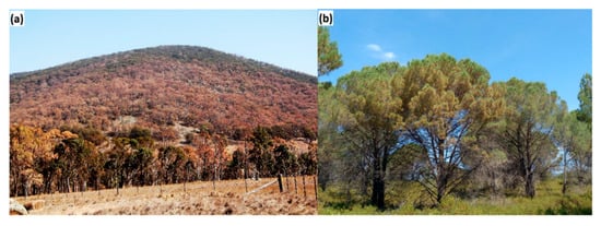 (a) Eucalypt woodland in north-eastern New South Wales, Australia, during severe drought in October 2019, illustrating the conversion of live fuels (i.e., foliage) into dead fuels. In this region, over five million hectares was subject to wildfire in 2019/2020. (b) Seasonal needle senescence in Pinus halepensis in Catalonia, Spain. Several days following this photo (22 June 2019), large fires occurred nearby. Image credit: Carles Arteaga.