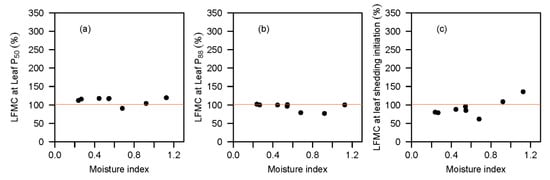 Value of LFMC at (a) leaf P50, (b) leaf P88 and (c) initiation of leaf shedding (when up to 10% leaf shedding had occurred) for eight species of Eucalyptus. The y-axis range is the same as for Figure 3, to illustrate the range of LFMC values observed in the case study. The horizontal lines represent the LFMC threshold (~102%) associated with a step-change in fire activity for south-eastern Australian eucalypt forests and woodlands (see [9]).