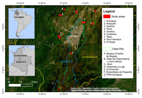Study localities in the hinterland of Bogotá, in Cundinamarca department and Bogotá D.C., Colombia. Small map top left: Colombia; lower left: Cundinamarca department and Bogotá D.C. in Colombia. Cited protected areas (Cited PAs) in Legend refers to the reserves/natural parks cited and discussed in the text. Bogotá D.C. boundaries are outlined in blue, and Cundinamarca department borders are outlined in yellow.