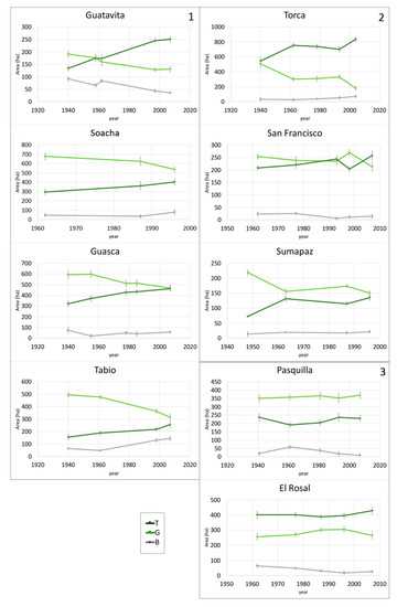 Based on the forest cover trends identified, the study localities can be divided into three groups: (i) Group 1 includes Guatavita, Soacha, Guasca, and Tabio. This group is characterized by a well defined increase in forest cover with no or very little decrease during the study period; (ii) Group 2 includes Torca, San Francisco, and Sumapaz, and is characterized by an initial increase in forest cover, followed by a decrease occurring around the 1990s and then, again, a final increase; (iii) Group 3 includes Pasquilla and El Rosal, which are characterized by an initial decrease of forest cover and a later increase that started in the 80ies.
