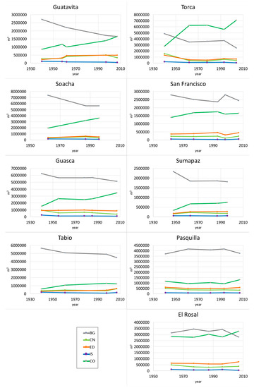 The share of the connector group (loops, bridges, and branches), which includes the potential corridors for the species dispersal that connects the core areas [86], decreased noticeably through time only in Guasca and Pasquilla. The share of the edge group (perforations and edge MSPA classes), which is directly related to fragmentation [5,86,87], increased constantly through time in Guatavita and Tabio, and also slightly in Sumapaz.