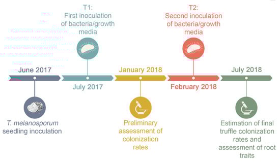 Timeline of the bacteria and truffle co-inoculation experiment performed in a commercial nursery (Vilanova de Meià, Lleida, Spain) between June 2017 and July 2018.