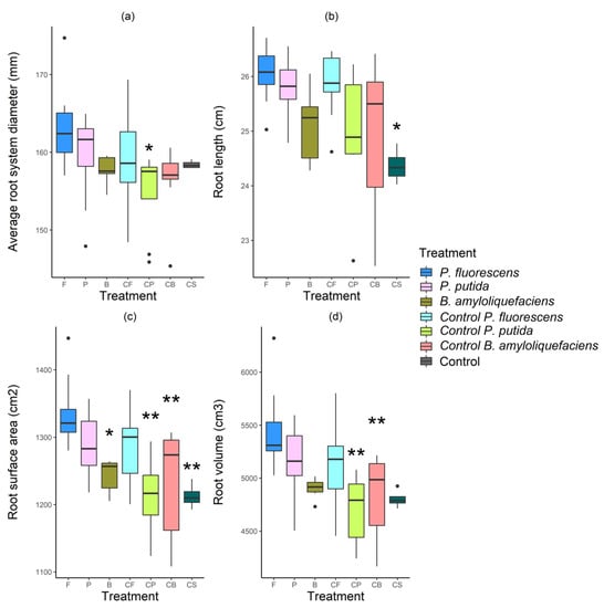 Root traits of Quercus faginea seedlings in a commercial nursery (Vilanova de Meià, Lleida, Spain) inoculated with Tuber melanosporum and then co-inoculated with either bacteria in growth media or growth media without bacteria between June 2017 and July 2018. (a) Average root system diameter (mm), (b) root length (cm), (c) surface area (cm2), (d) root volume (cm3) evaluated under the different treatments: Pseudomonas fluorescens in growth medium (F), Pseudomonas putida in growth medium (P), Bacillus amyloliquefaciens in growth medium (B), P. fluorescens growth medium control (CF), P. putida growth medium control (CP), B. amyloliquefaciens growth medium control (CB), and control seedlings (CS) that were not inoculated with bacteria or a bacterial growth medium. p-values (** p < 0.01 and * p < 0.05) are indicated above boxplots to indicate specific treatments that resulted in significantly lower root trait values than that of seedlings that were co-inoculated with P. fluorescens (F).
