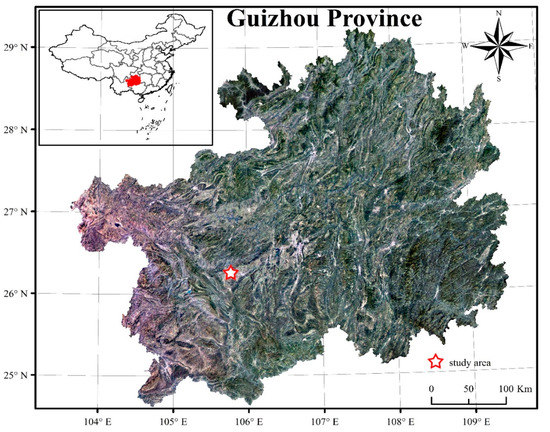 The study area was located in a Karst area of Puding County, Guizhou province, southwestern China (E: 105°27′49″–105°58′51″, N: 26°9′36″–26°31′42″) as displayed in Figure 1. The elevation of the site ranges from 1100 to 1600 m above sea level. This area is affected by the north subtropical humid monsoon climate and the mean annual precipitation and temperature of this region are 1390 mm and 15.1 °C, respectively.