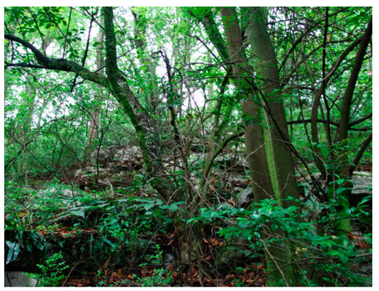 As previously mentioned, calcareous soil (Chinese soil genetic classification or United States Department of Agriculture (USDA) soil taxonomy) and yellow soils (Chinese soil genetic classification) are the main soil types found in this region. Over the last decade, this area has been in direct contact with expansion due to human activities and wide deforestation processes have significantly modified it. After field observation, it was found that within this area of study there were two typical vegetation types, which could be related to F and FS (Figure 2 and Figure 3).