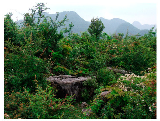 Due to its nature, karst land is characterized by rocks that contain acid-insoluble material, which makes the soil formation an extremely low process. Wang and Zhang (1999) [18] found that the formation of 1 cm of soil in the limestone area of southwest China required 4000 to 5000 years. Another example is associated with the rockiness rate of the Maolan Karst forest. In this forest, the level of rocks can be 70–80%, and only a small amount of soil exists in the rock crevice. In parallel, soil erosion is quite consistent, leading to extremely shallow soil in the karst area [19]. It was reported that the mean depth of topsoil on the karst hills was only about 2–9 cm [20,21], and therefore the lack of soil reflects on the lack of water and hence less nutrients available. The droughts caused by karst landforms have also been considered to be the most important factors limiting plant growth and vegetation restoration in this karst region [22].